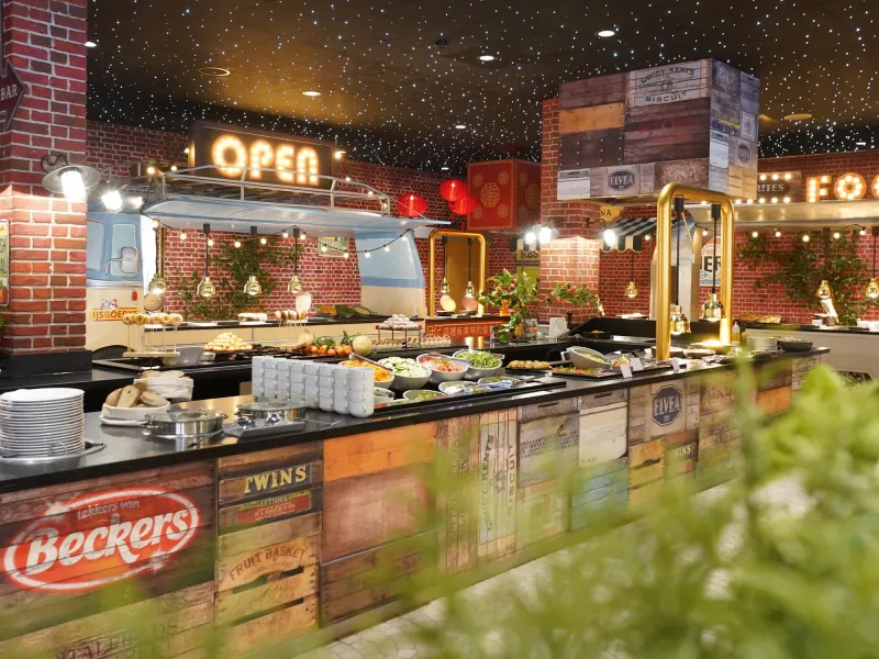 In Restaurant Le Grand Buffet vind je foodtrucks met heerlijke gerechten: een uitgebreid assortiment aan voorgerechten, hoofdgerechten en desserts staat voor je klaar! Geniet van een mix van diverse salades, vlees- en visgerechten, pasta's, groenten en meer. Kinderen kunnen smullen van het speciale kinderbuffet.