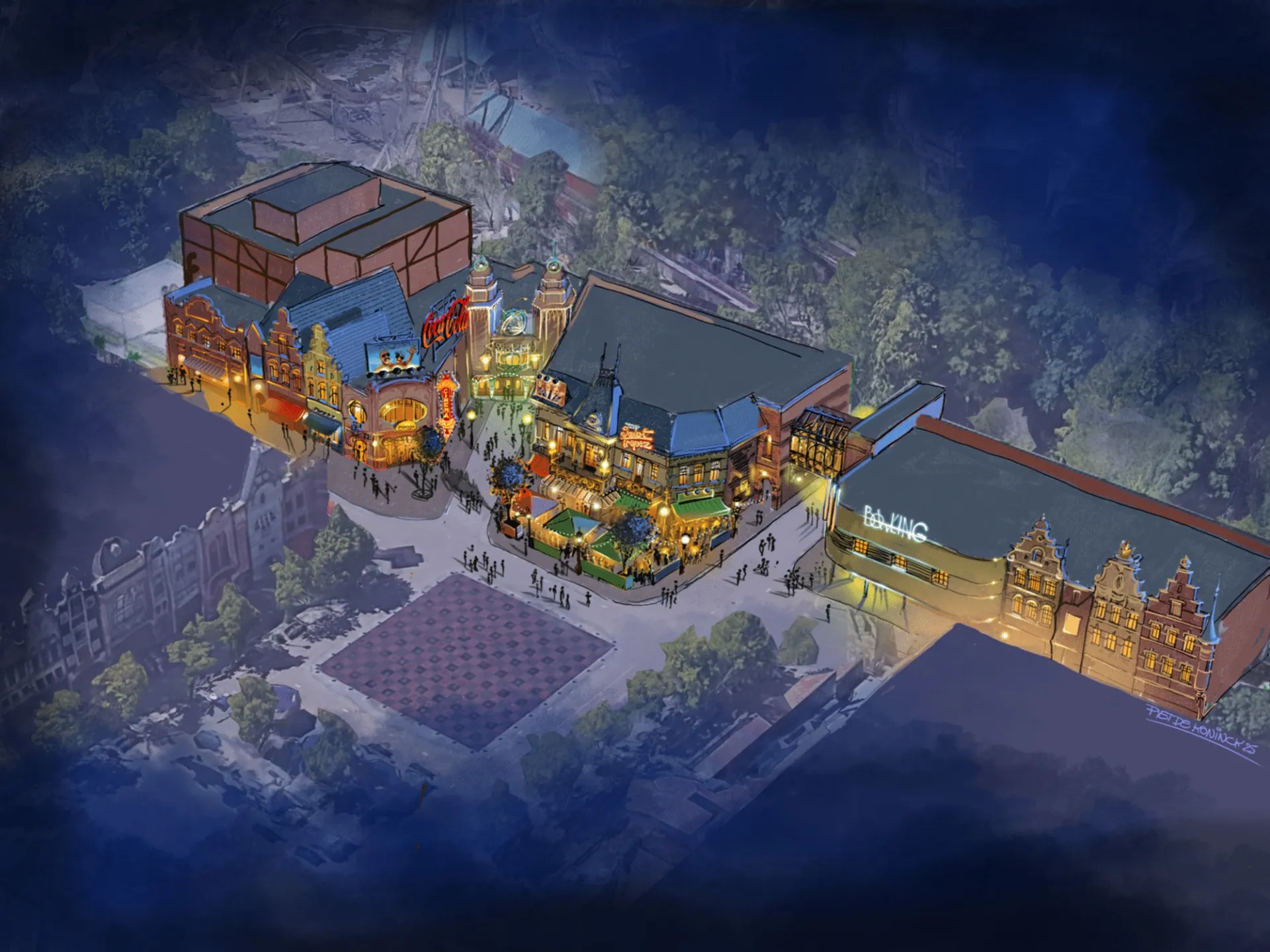 Plopsaland Belgium is investing no less than 25 million euros in the construction of Plopsaland Plaza, the largest expansion in the park’s history. The new complex, opening in 2027, will include a brand-new attraction, the Grand Café, a bowling alley, and the main station of the iconic Plopsa Express.